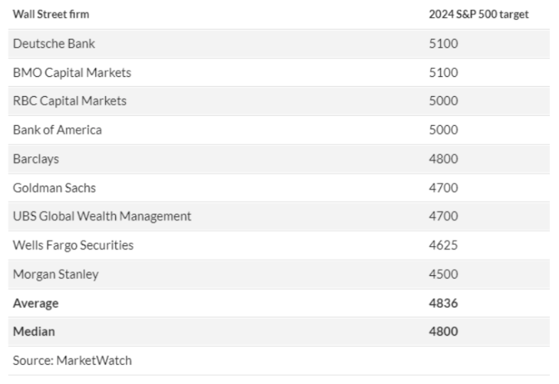 Queste erano le previsioni degli analisti rilasciate a dicembre 2023: considerando la media e la mediana, ci si aspettava che l’S&P 500 avrebbe chiuso intorno ai 4800 punti.